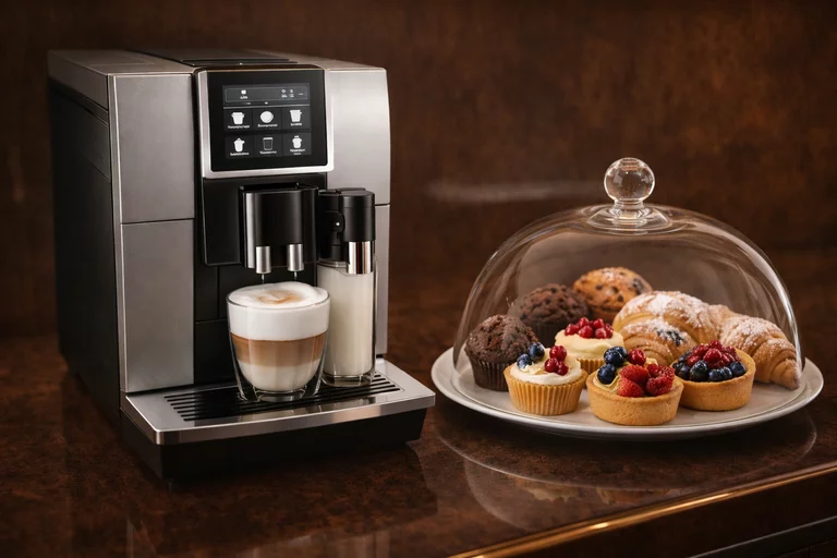 Ein moderner Kaffeevollautomat ermöglicht jederzeit frisch zubereitete Kaffeespezialitäten. Ergänzt wird das Angebot durch süße Teilchen und kleine Desserts, stilvoll präsentiert und geschützt – für genussvolle Momente zwischendurch.