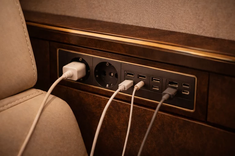 Jeder Sitzplatz ist mit 230-V-Steckdosen sowie USB-A- und USB-C-Anschlüssen ausgestattet.